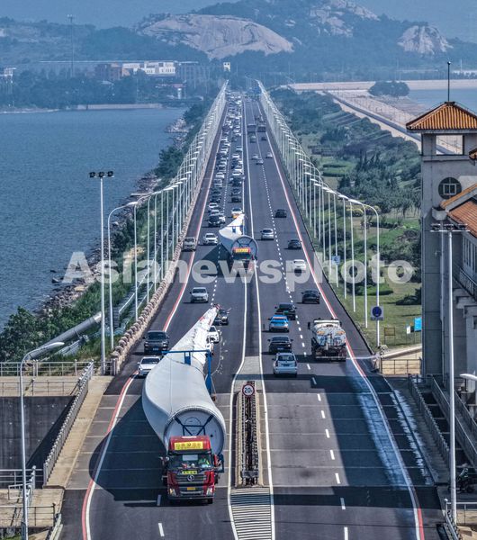 2025年7月10日,山东省荣成市石岛管理区,超大型风电叶片通过陆运发往作业区进行安装。