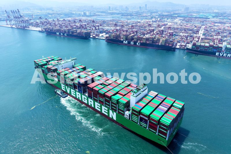 图片说明:2025年7月11日,“长荣海运 Evergreen”399.9 米超级巨轮满载外贸集装箱驶入山东港口青岛港。