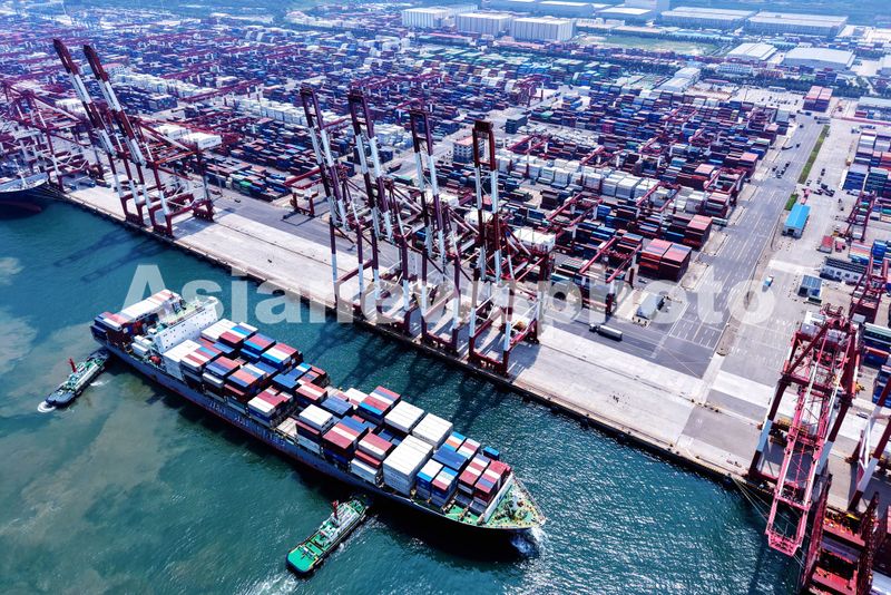 图片说明:2025年7月11日,山东港口青岛港,装载外贸集装箱货轮在拖船辅助下停靠泊位。