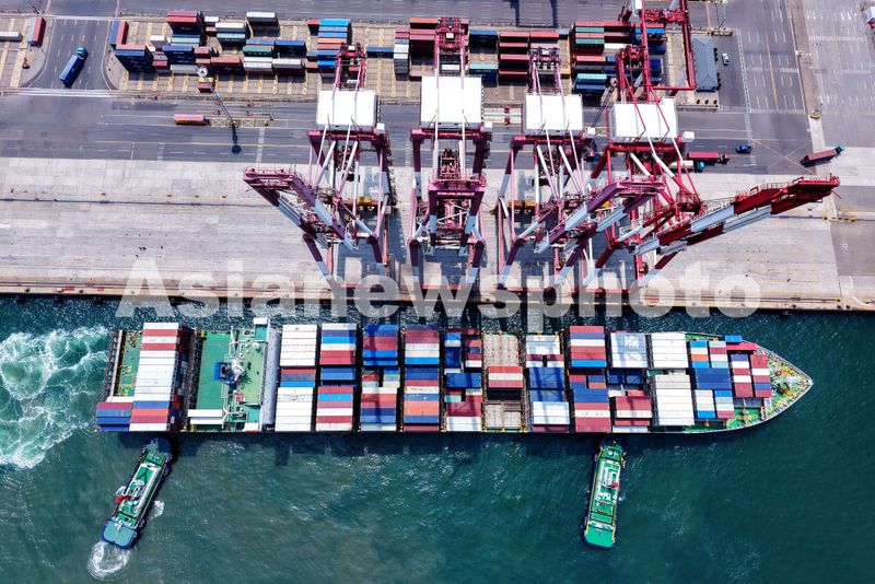 图片说明:2025年7月11日,山东港口青岛港,装载外贸集装箱货轮在拖船辅助下停靠泊位。