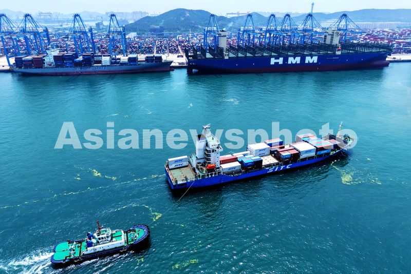 图片说明:2025年7月11日,山东港口青岛港,一艘装载外贸集装箱货轮驶入港口。