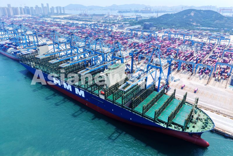 图片说明:2025年7月11日,山东港口青岛港,货轮在装卸外贸集装箱。