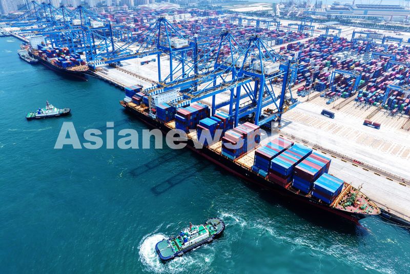 图片说明:2025年7月11日,山东港口青岛港,装载外贸集装箱货轮在拖船辅助下停靠泊位。