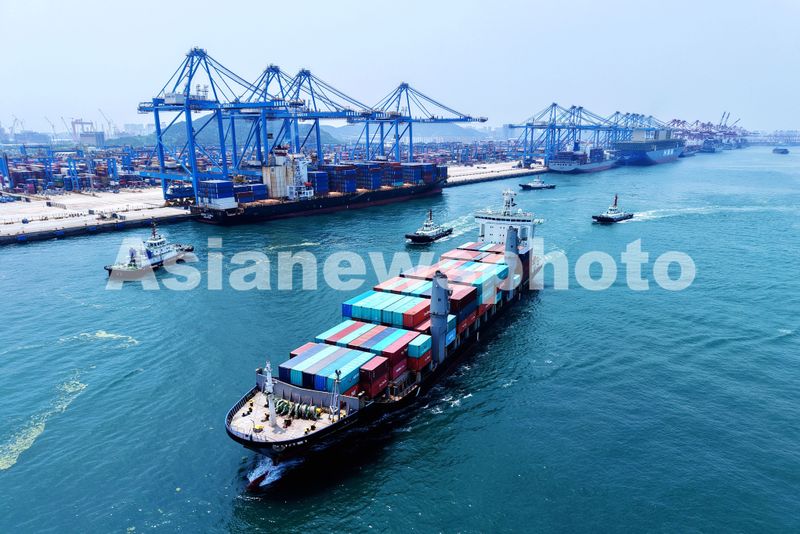 图片说明:2025年7月11日,山东港口青岛港,一艘装载外贸集装箱货轮驶出港口。