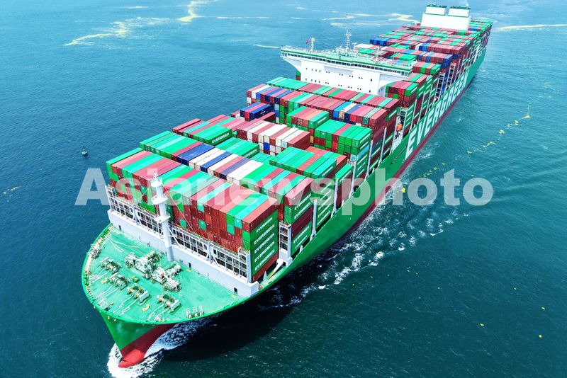 图片说明:2025年7月11日,“长荣海运 Evergreen”399.9 米超级巨轮满载外贸集装箱驶入山东港口青岛港。
