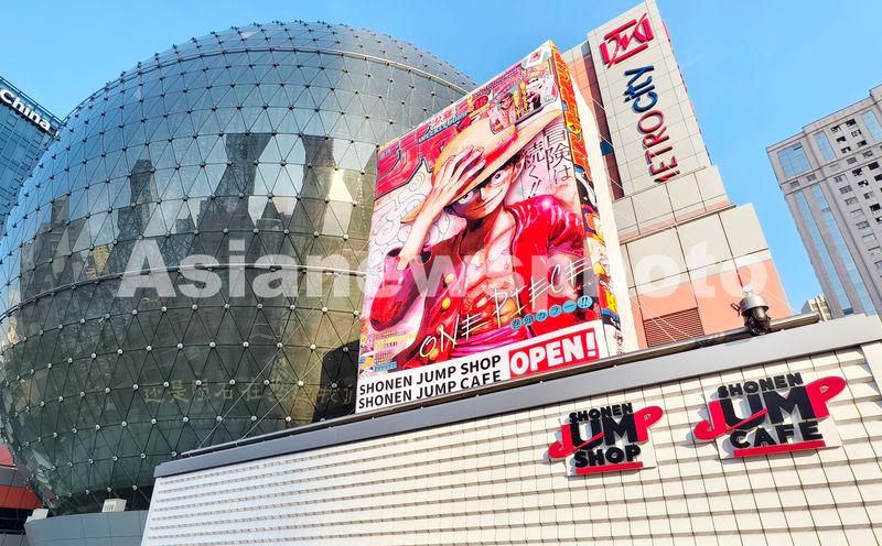 图片说明:2025年7月14日,全球首座日本JUMP二次元商业综合体落户上海美罗城,商场外竖立起以经典名作《海贼王(航海王)》为封面的巨型《周刊少年JUMP》杂志充气模型。