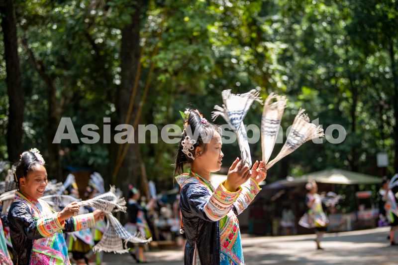 2025年7月17日,岜沙苗寨的村民在为游客表演民族舞蹈。