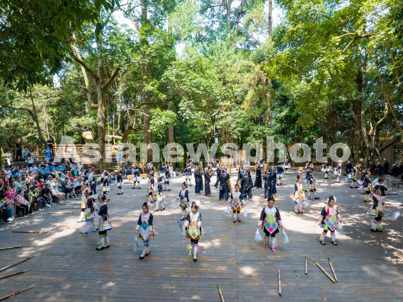2025年7月17日,岜沙苗寨的村民在为游客表演民族舞蹈(无人机照片)。
