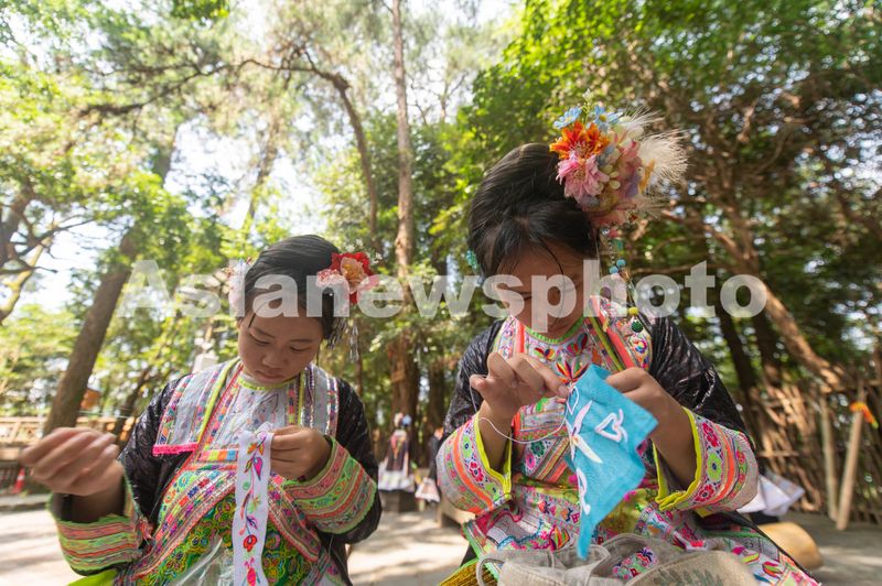 2025年7月17日,岜沙苗寨的村民在为游客展示苗族刺绣。