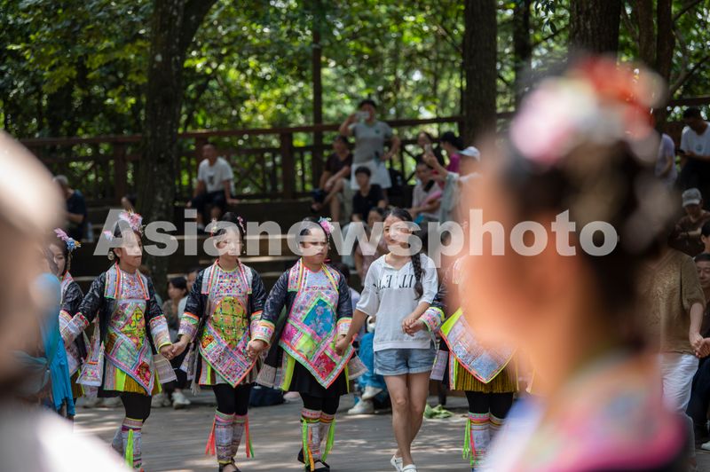 2025年7月17日,游客在岜沙苗寨参与舞蹈互动。