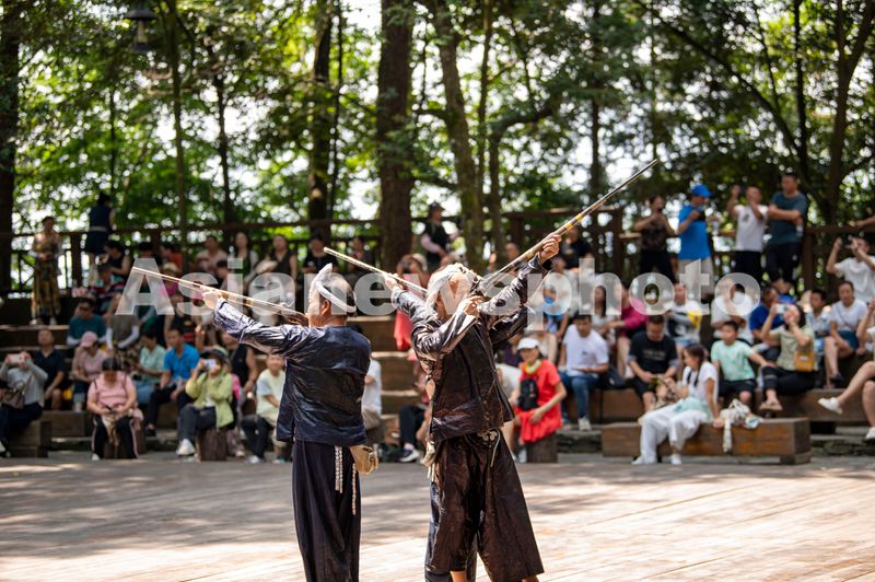 2025年7月17日,岜沙苗寨的村民在为游客表演民族舞蹈。