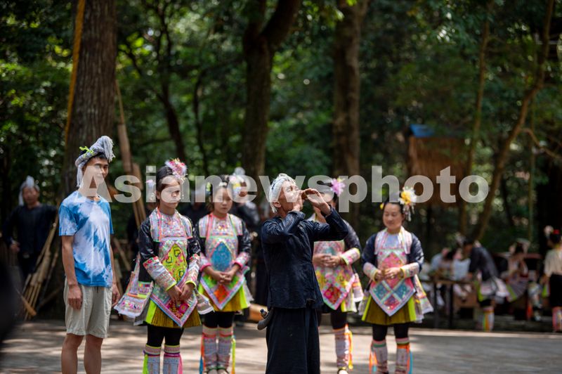 2025年7月17日,游客在岜沙苗寨参与苗族婚俗表演。