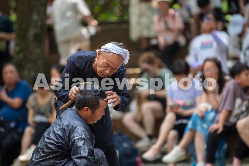 2025年7月17日,岜沙苗寨的村民在为游客表演镰刀剃头。
