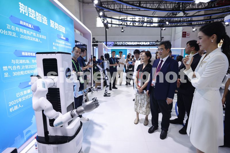 图片说明:2025年7月16日,北京,参观者在第三届中国国际供应链促进博览会上观看机器人表演。