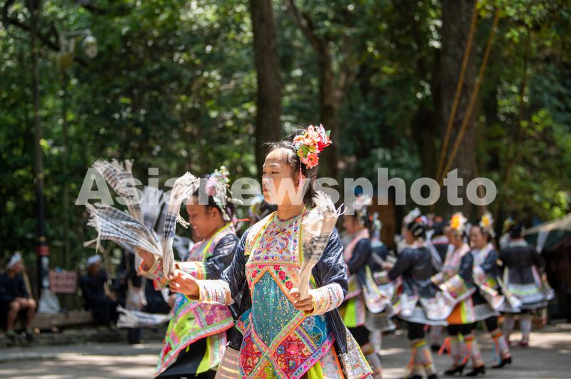 2025年7月17日,岜沙苗寨的村民在为游客表演民族舞蹈。