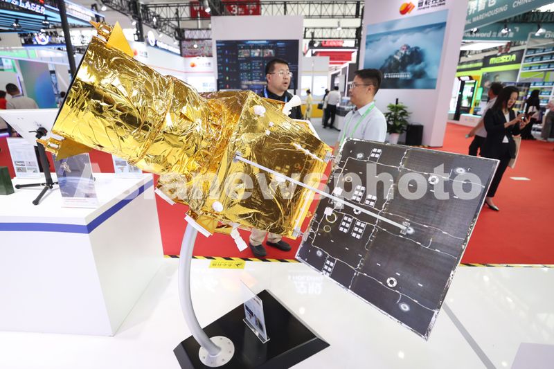图片说明:2025年7月16日,北京,工作人员在第三届中国国际供应链促进博览会上介绍“烟台二号”卫星模型。