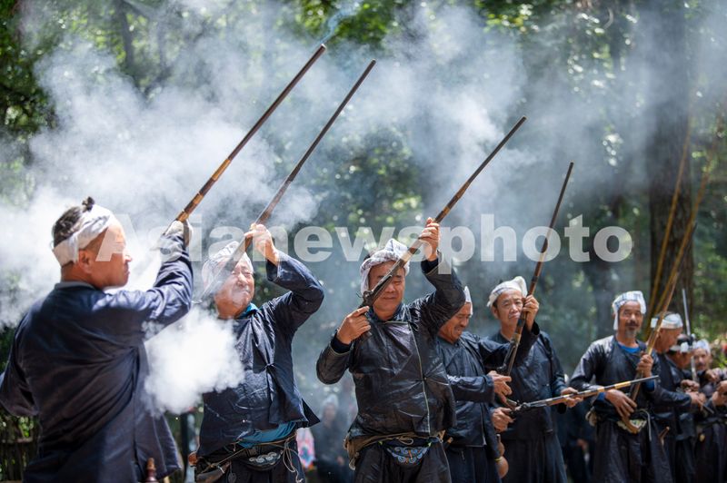 2025年7月17日,岜沙苗寨的村民在为游客表演节目。
