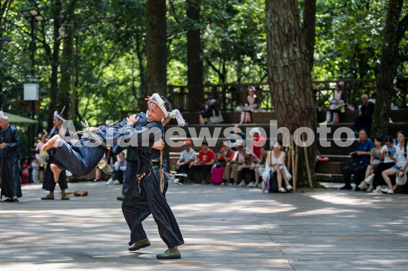 2025年7月17日,岜沙苗寨的村民在为游客表演民族舞蹈。