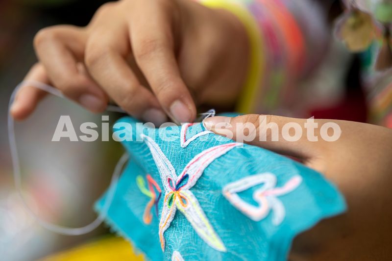 2025年7月17日,岜沙苗寨的村民在为游客展示苗族刺绣。