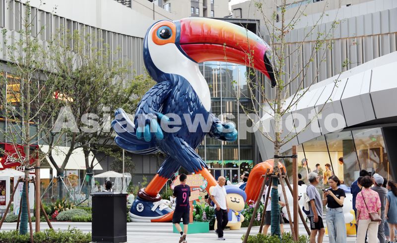 2025年7月19日,上海旅游节国际动漫月,波普艺术家肯·凯勒赫创作的巨嘴鸟大型趣味卡通艺术雕塑亮相以二次元商业文化为特色的徐汇元宇宙街区“元界”街头。