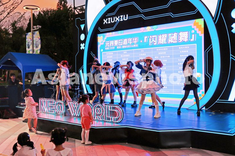 2025年7月19日,上海旅游节国际动漫月,徐汇元宇宙街区“元界”举办二次元夏日狂欢节,舞台COSPLAY宅舞表演渲染快乐狂欢气氛,吸引不少小朋友跃跃欲试。