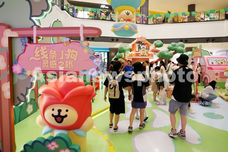 2025年7月19日,上海旅游节国际动漫月,治愈系顶流IP线条小狗中国首展亮相徐汇元宇宙街区“元界”,商场内奇幻童趣的二次元卡通公园吸引游客打卡。