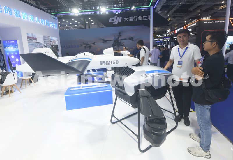 图片说明:2025年7月23日,观众在2025国际低空经济博览会上观看采用氢能为动力的无人机系统。