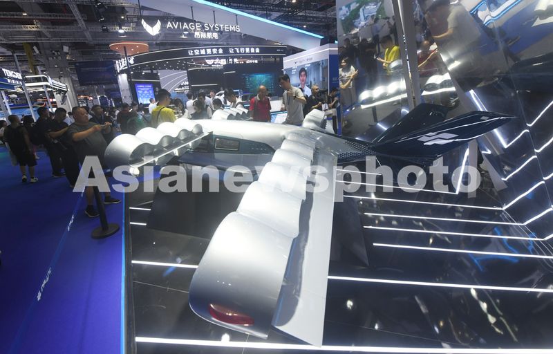 图片说明:2025年7月23日,观众在2025国际低空经济博览会上观看7座级倾转涵道电动垂直起降飞行器(eVTOL)模型。