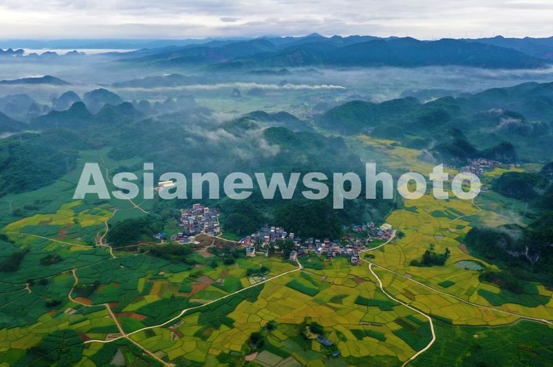 2025年7月24日,地处深山的广西融水苗族自治县融水镇东良村,成片的优质早稻喜获丰收,金黄的稻田与晨雾、村落、青山等相映成景,构成一幅幅美丽的“丰”景画卷。