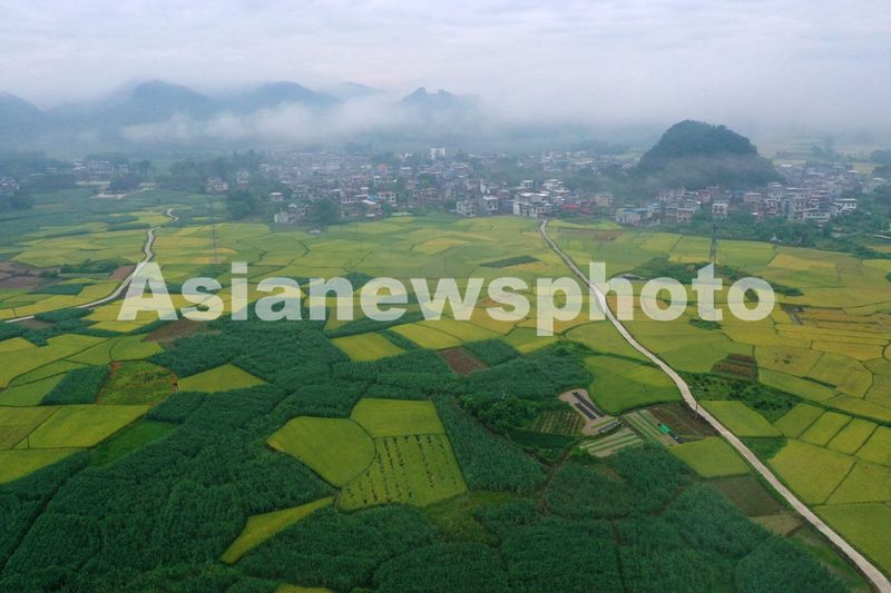 2025年7月24日,地处深山的广西融水苗族自治县融水镇东良村,成片的优质早稻喜获丰收,金黄的稻田与晨雾、村落、青山等相映成景,构成一幅幅美丽的“丰”景画卷。