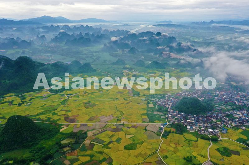 2025年7月24日,地处深山的广西融水苗族自治县融水镇东良村,成片的优质早稻喜获丰收,金黄的稻田与晨雾、村落、青山等相映成景,构成一幅幅美丽的“丰”景画卷。
