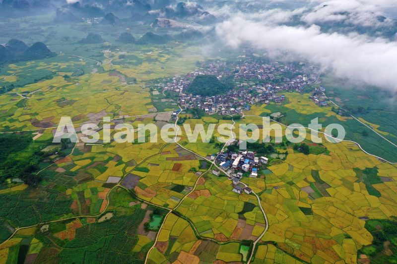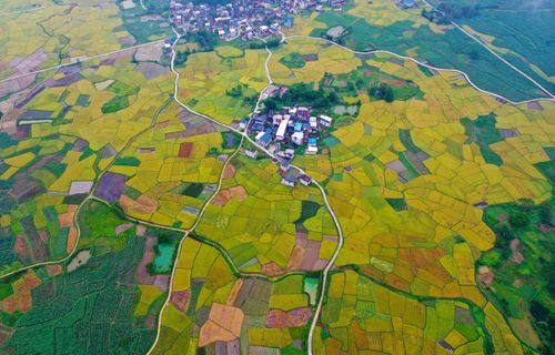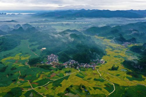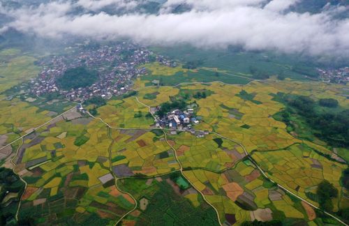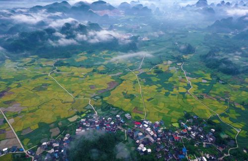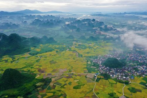 2025年7月24日,地处深山的广西融水苗族自治县融水镇东良村,成片的优质早稻喜获丰收,金黄的稻田与晨雾、村落、青山等相映成景,构成一幅幅美丽的“丰”景画卷。