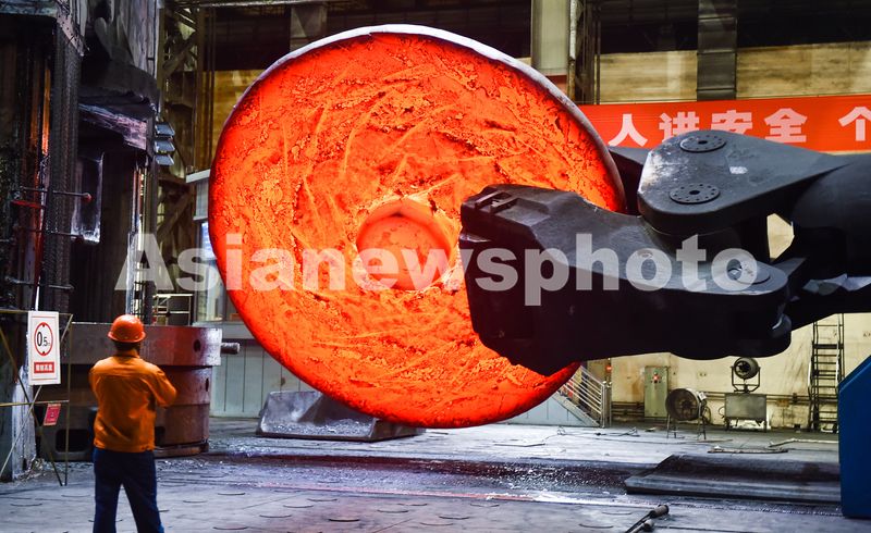 2025年7月25日,位于河南省洛阳市涧西区的中信重工锻压车间内,工人正在锻压一批直径超6米的超大型高端铸锻件产品。