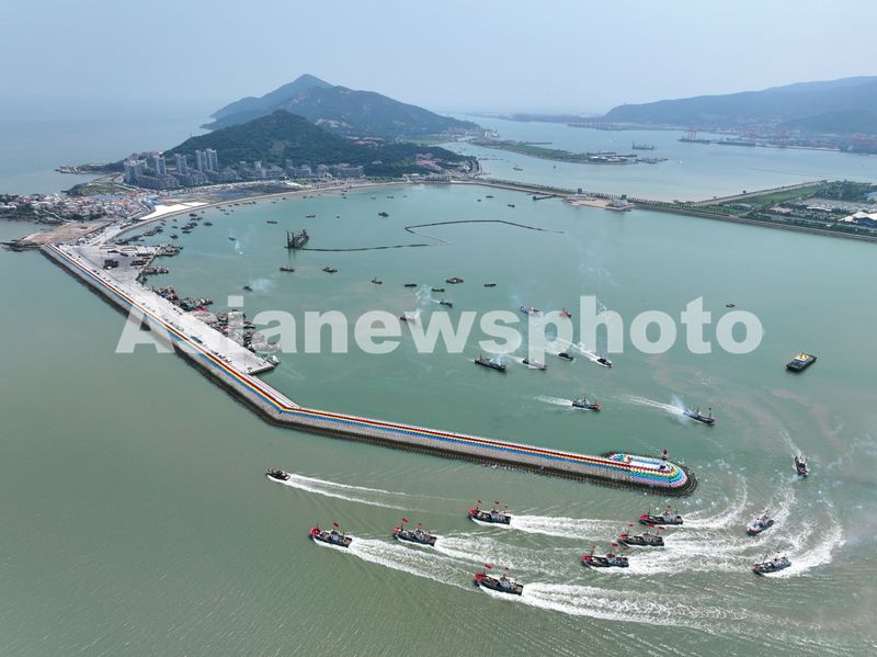 图片说明:2025年8月5日,渔船从江苏省连云港市连岛中心渔港出发驶向近海海域捕捞作业。