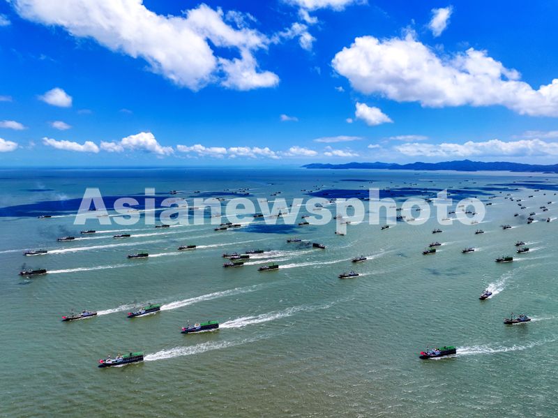 8月5日,浙江省舟山市岱山县后沙洋海域,大批渔船驶往渔场,准备开启捕捞作业。