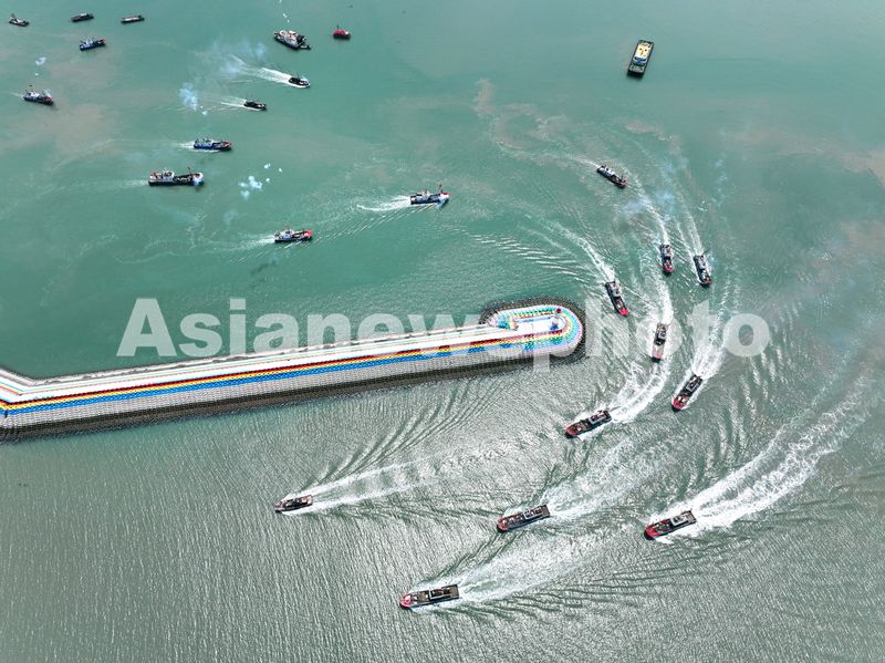 图片说明:2025年8月5日,渔船从江苏省连云港市连岛中心渔港出发驶向近海海域捕捞作业。
