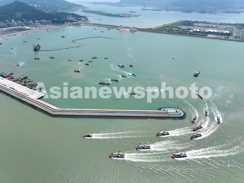 图片说明:2025年8月5日,渔船从江苏省连云港市连岛中心渔港出发驶向近海海域捕捞作业。