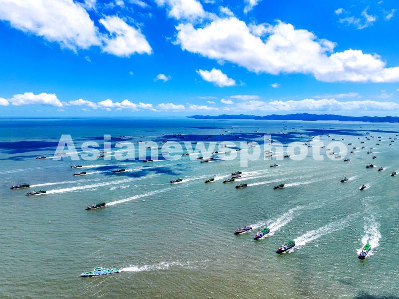 8月5日,浙江省舟山市岱山县后沙洋海域,大批渔船驶往渔场,准备开启捕捞作业。