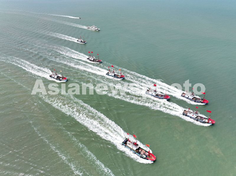 图片说明:2025年8月5日,渔船从江苏省连云港市连岛中心渔港出发驶向近海海域捕捞作业。