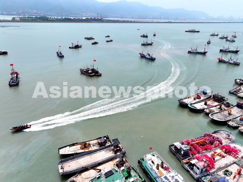 图片说明:2025年8月5日,渔船从江苏省连云港市连岛中心渔港出发驶向近海海域捕捞作业。