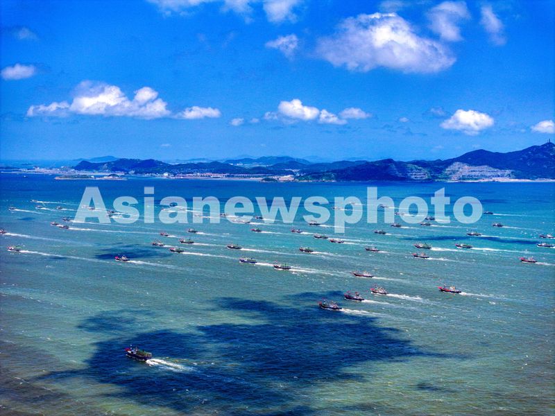 8月5日,浙江省舟山市岱山县后沙洋海域,大批渔船驶往渔场,准备开启捕捞作业。