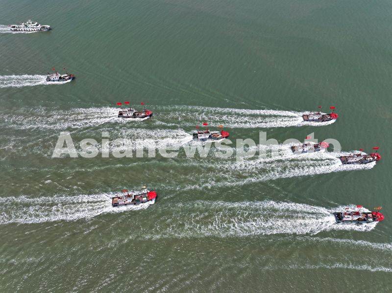 图片说明:2025年8月5日,渔船从江苏省连云港市连岛中心渔港出发驶向近海海域捕捞作业。