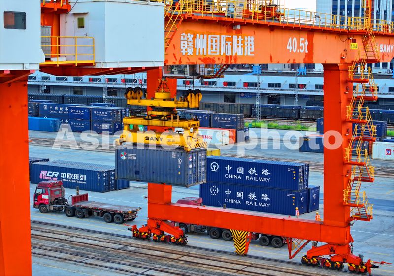 图片说明:2025年8月6日,位于江西省赣州市南康区龙岭镇的赣州国际陆港运输作业繁忙,中欧班列集装箱装卸有序进行。