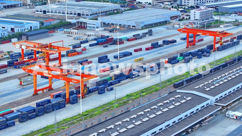 图片说明:2025年8月6日,位于江西省赣州市南康区龙岭镇的赣州国际陆港运输作业繁忙,中欧班列集装箱装卸有序进行。