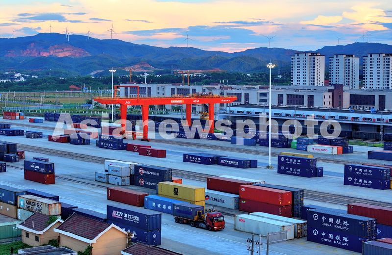 图片说明:2025年8月6日,位于江西省赣州市南康区龙岭镇的赣州国际陆港运输作业繁忙,中欧班列集装箱装卸有序进行。