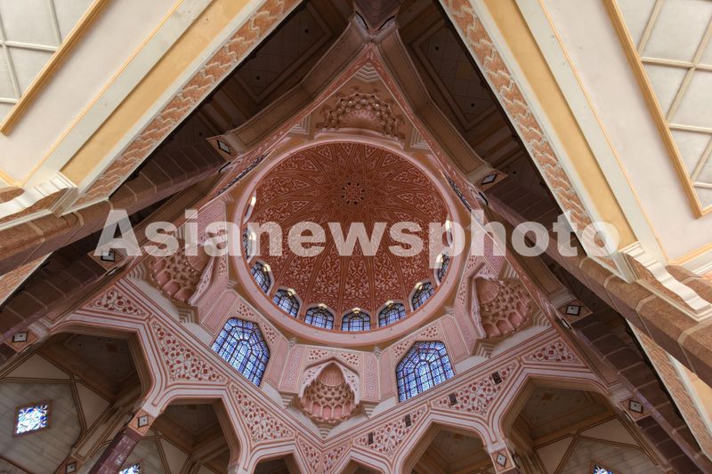2025年8月2日,马来西亚新行政中心布城(太子城)的粉红清真寺内游客众多。
