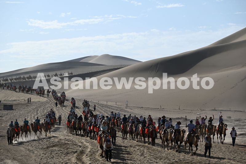 2025年8月9日,游客在甘肃省敦煌市鸣沙山月牙泉景区游览。 进入暑期以来,甘肃省敦煌市迎来旅游高峰。众多游客走进丝路敦煌,领略大漠风情,感受文化魅力。
