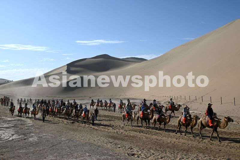 2025年8月9日,游客在甘肃省敦煌市鸣沙山月牙泉景区游览。