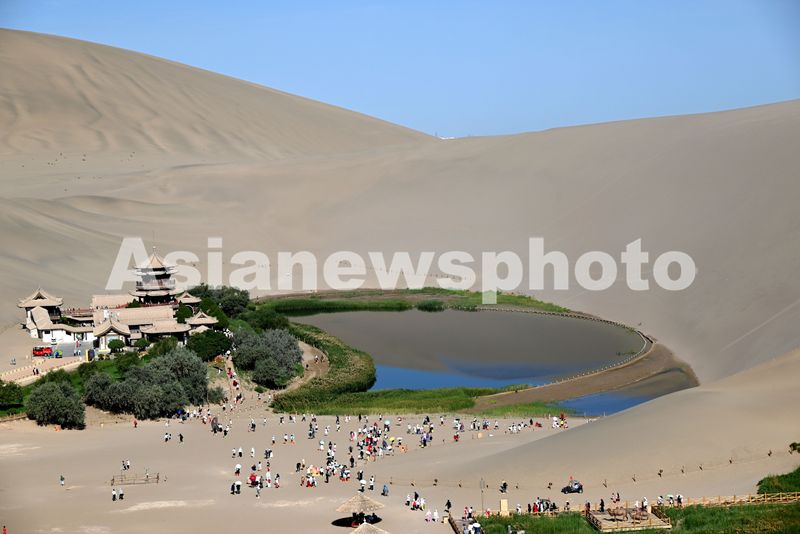 2025年8月9日,游客在甘肃省敦煌市鸣沙山月牙泉景区游览。