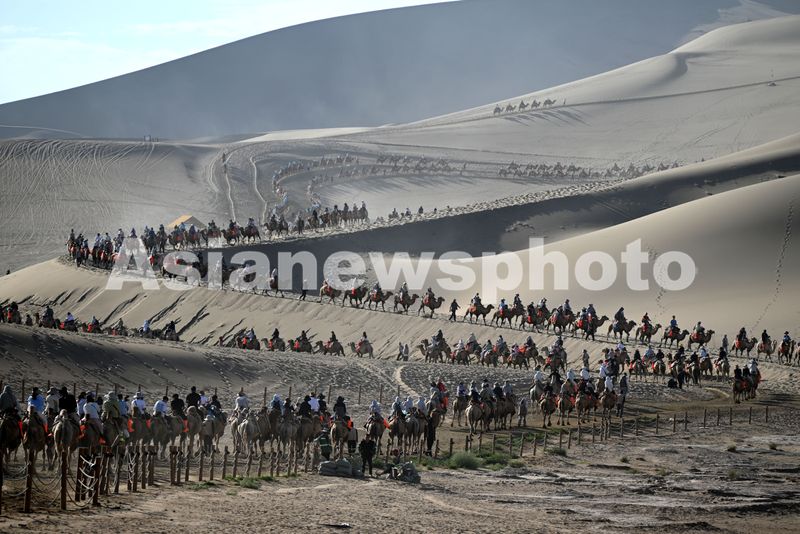 2025年8月9日,游客在甘肃省敦煌市鸣沙山月牙泉景区游览。